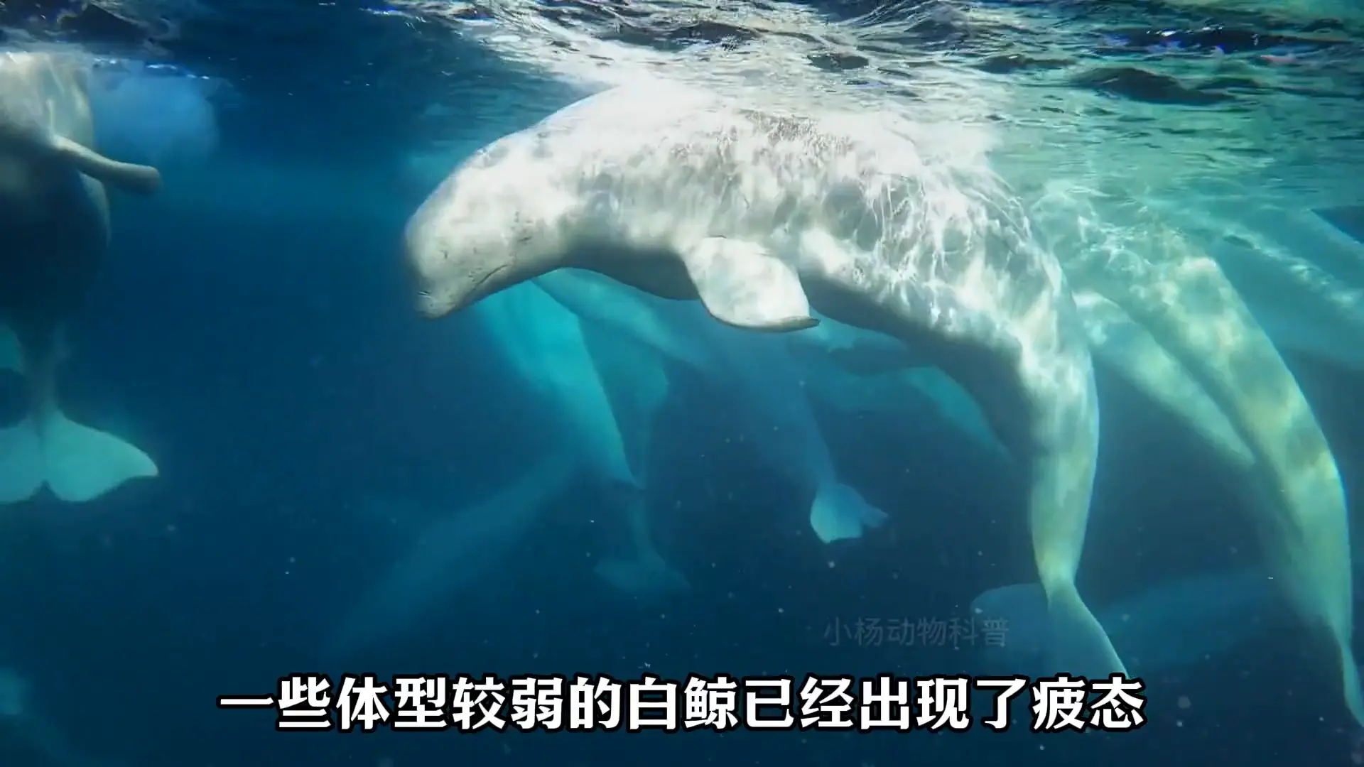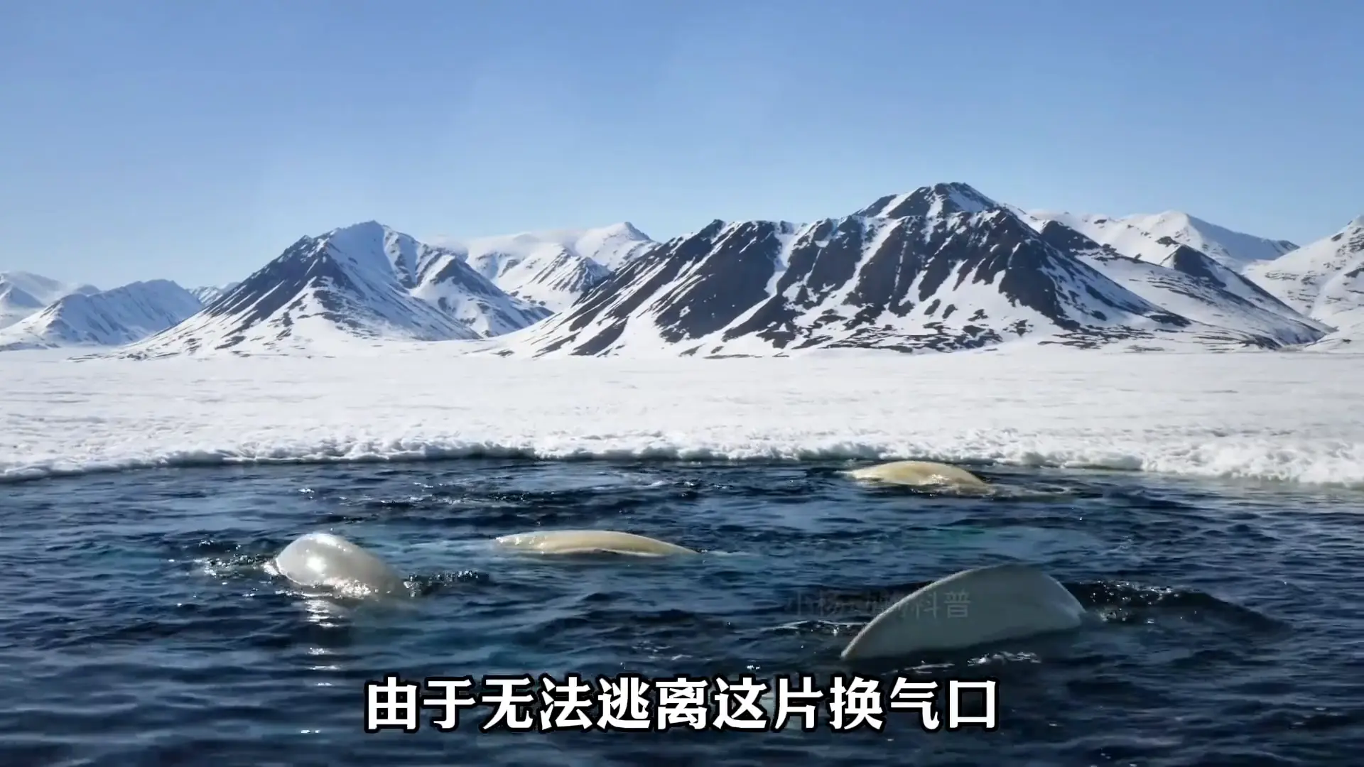 30多头白鲸照旧被困在这里5个月了,为了不让海水结冰,它们必须日夜不休的搅拌海水,一朝洞口被冰封,它们很快就会因窒息而一火。