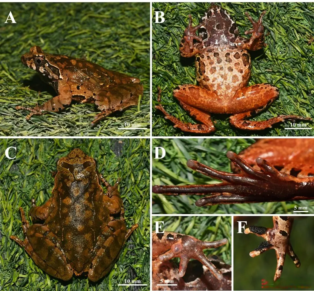 据先容,随和角蟾隶属于角蟾科角蟾属。系统发育分析清楚,该物种归入峨眉角蟾物种组,是一个寂然的演化分支。与近缘物种比拟,随和角蟾在体型、肢体结构及养殖期特征等方面均发扬出显赫各异:其体型中等偏大,雄性体长为45.3—51.1毫米,雌性为55.6—58.2毫米;头部宽于长,动作修长,胫跗重要前伸可向上吻端;趾间具微蹼,并伴有发达的侧缘褶;养殖期雄性内侧两指具有密集且中等大小的玄色锥状婚垫刺,识别特征显明。